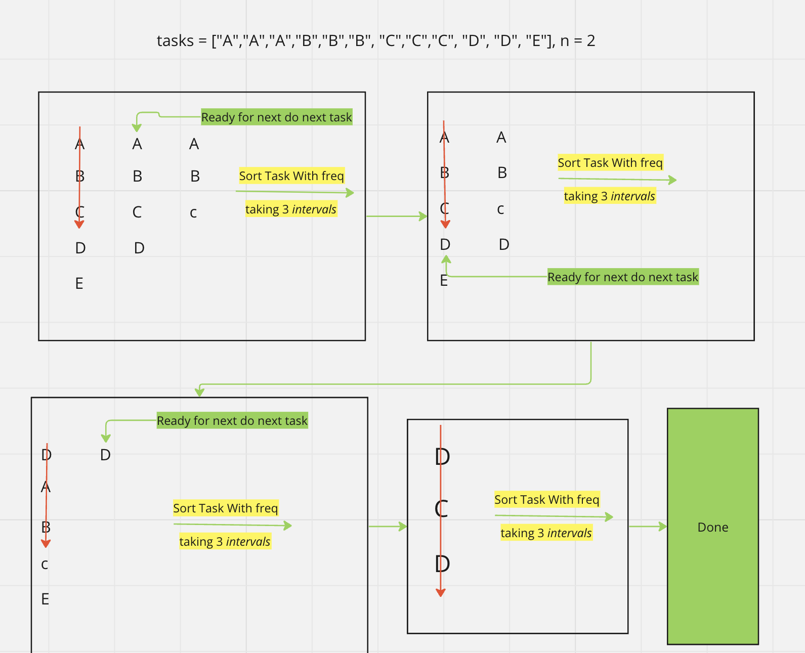 tasks = ['A', 'A', 'A', 'B', 'B', 'B', 'C', 'C', 'C', 'D', 'D', 'E'], n = 2